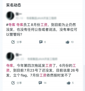 投诉者不只是消费者,还有寺库员工表示被公司拖欠工资。北京商报记者在脉脉App中看到,有多个认证为寺库员工的用户投诉工资被拖欠。其中,认证为“寺库集团JAVA开发工程师”的员工表示:“8月的工资到目前为止仍然没发,也没有任何公告或者说法。这已经是寺库今年第四次拖延发工资了。”
