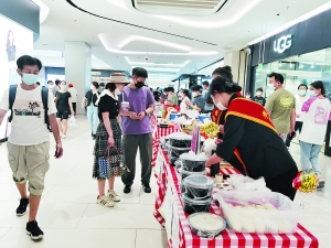 除了转型线上,线下也仍有可以变通的方法。就像梁夏所在的店铺,便在线下摆起了“小摊”。据悉,梁夏所在的商场专门辟出了一块地方,让商户们进行“摆摊”,从而提高营收,餐饮店员工们各摆一张小桌子摆上包装好的食品,供前来逛商场的消费者挑选。