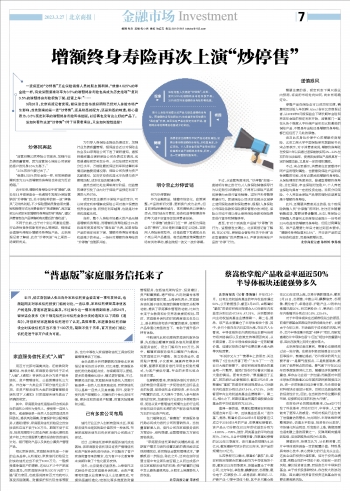另外,北京商报记者获悉,上海信托正式新设并成立家庭服务信托部,由资产管理和财富从业背景专业人士组建而成,可提供涵盖标准化/定制化等多维度的财富管理服务,包括信托架构设计、投资建议、资产配置策略、遗产规划、代际财富传承等综合财富管理方案。上海信托表示,家庭服务信托基于信托制度的隔离和指定分配等功能,提供了家庭事件管理的功能,比如为未来子女教育和补充养老做提前规划。同时,家庭服务信托的时间跨度是五年及以上,是长期投资和资产配置的载体,在理财产品净值化转型的当下,有助于提升客户持有体验。