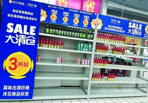 家乐福中国内地首店进入停业倒计时阶段。3月26日,北京商报记者走访家乐福创益佳店看到,店内大多数货架空置,水果、干货、熟食等区域已无商品在售,一些未售完的蛋品、日用品等商品被堆放在一起,已用胶带打包好。收银台附近摆放的“大清仓”货架上标有“3折起”优惠,主要是酒水、饮料等。