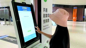 据此,北京商报记者在大兴机场站进行了体验。首先,是在站内自动售票处的“刷掌”注册机上开通“刷掌”乘车。跟随屏幕的指引,记者点进注册机首页呈现的“开通‘刷掌’乘车”选项,阅读并同意《刷掌服务须知》后,便开始录入掌纹。此时,需将手掌悬空置于屏幕下方一个圆环灯圈起来的手掌识别区域,当识别区识别到手掌时,圆环的灯便由常亮的绿色转为白色,完成录入后,设备会发出“嘟”的一声提示,圆环又再次变回绿色。随后,屏幕上出现“录入成功”字样及二维码,扫描二维码在微信小程序中完成协议授权、实名信息授权等流程之后,即可开通“刷掌”乘车业务。接下来便是服务开通后的乘车过程。