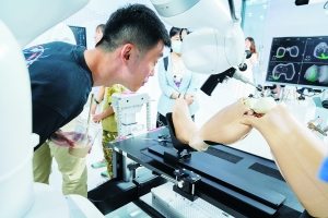 北京商报记者在成就展展厅看到,一家医疗企业正进行一场不寻常的手术,而操作手术的不是医生而是机器人。这位“主刀”是北京医疗健康企业纳通带来的NABRAI智能手术室系统,该系统基于自主研发的IOR-OS智能开放式信息平台,联动多样化高精尖智能设备,通过信息化、数字化、AI智能化等手段实现医院外科手术室平台数据整合。直观来看,就是通过数字化技术,帮助骨科医生实现快速、准确的手术操作。