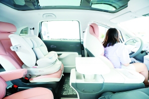 拉开极狐考拉的右侧电动侧滑门后发现,后排左侧的儿童座椅可通过自动迎宾功能向外旋转。“这样的设计是为宝妈抱着小朋友时,更方便将孩子放在座椅中。”坐进车内,点击中控交互屏上一个“摇篮”形状按键,大屏弹出界面选项包括宝宝安睡、儿童座椅通风、宝宝哭闹等功能按键。点开宝宝哭闹功能,屏幕上会直接播放“宝宝巴士”等节目。