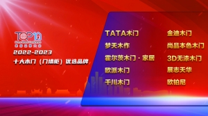 2023第七届家居品牌大会2023年7月27日在北京香山饭店举行,现场发布34个“2022-2023家居十大优选品牌”榜单,其中TATA木门、梦天木作、霍尔茨木门·家居、欧派木门、千川木门、金迪木门、尚品本色木门、3D无漆木门、展志天华、欧铂尼上榜“2022-2023十大木门(门墙柜)优选品牌”,它们是2022-2023年度里以木门为主营业务并提供门墙柜一体化解决方案的十个优秀品牌代表。