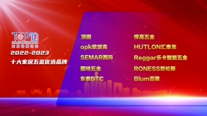 2023第七届家居品牌大会2023年7月27日在北京香山饭店举行,现场发布34个“2022-2023家居十大优选品牌”榜单,其中顶固、opk欧派克、SEMAR西玛、图特五金、东泰DTC、悍高五金、HUTLON汇泰龙、Reggar乐卡智能五金、RONESS劳伦斯、Blum百隆上榜“2022-2023十大家居五金优选品牌”,它们是2022-2023年度里为家居企业提供五金供应链服务的十个优秀品牌代表。