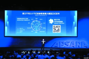 对于通义千问2.0,周靖人花了较长篇幅介绍,诸如“参数规模全面达到千亿级别”“通用指标评测处于国际领先水平”的字样,在PPT中放大显示。