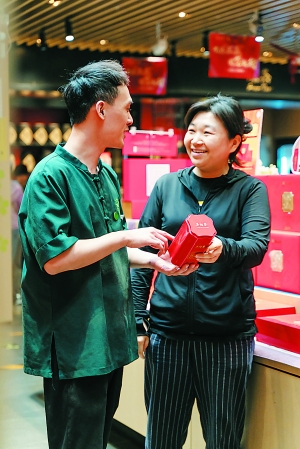 吴裕泰员工为顾客介绍产品